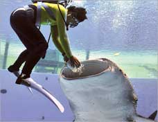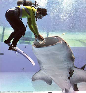 للوهلة الأولى بدت مهمة هذا الغواص مرعبة بينما كان يقوم بتقديم كمية من الطعام الى هذا القرش الحوتي في احد احواض اكواريوم «هاكيجيما» الكائن في العاصمة اليابانية طوكيو.