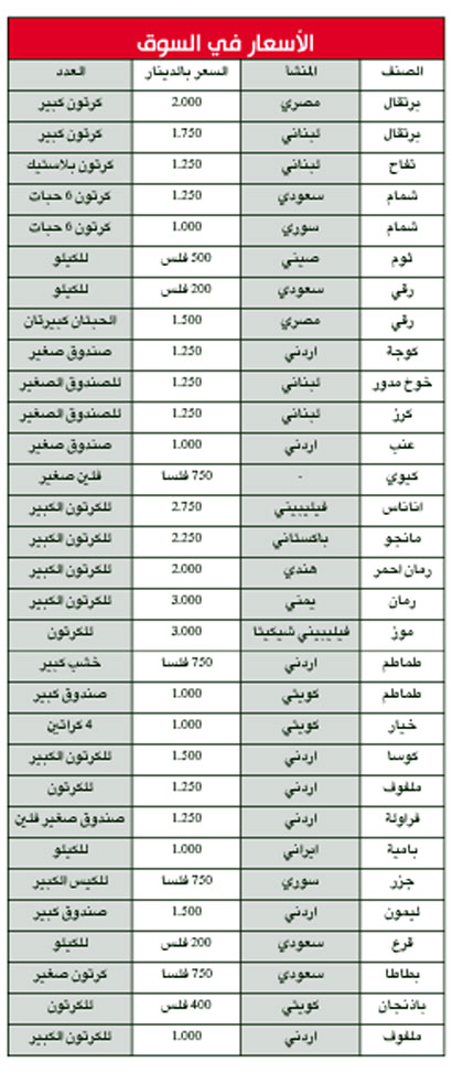 ويضيف: قمنا بفتح اكثر من مصدر لاستيراد الخضار والفواكه من الخارج لتوفير احتياجات المستهلكين وقمنا بادخال اكثر من 6 الى 7 برادات يوميا، حيث كنا ندخل في الاشهر الماضية بين 3 الى4 برادات يوميا بسبب اقتراب شهر رمضان المبارك، حيث ان المائدة في شهر رمضان لاتخلو ابدا من الخضار والفواكه ومن خلال جريدتكم «الراي» الغراء اطمئن الجميع بان لا ارتفاع في اسعار الخضار والفواكه في الشهر الكريم، ونسأل الله ان يتقبل من الجميع صيامهم وقيامهم.