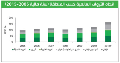 يذكر أن الثروة العالمية نمت بنسبة سنوية 8 في المئة لتصل إلى ما قيمته 121.8 تريليون دولار في عام 2010، ويتوقع أن تنمو تلك الثروة بما يقارب من 6 في المئة سنويا خلال السنوات القليلة المقبلة لتصل إلى ما قيمته 161.9 تريليون دولار في عام 2015، حيث تعتمد عوامل النمو تلك على الأسواق الناشئة في آسيا والشرق الأوسط وأمريكا اللاتينية.
