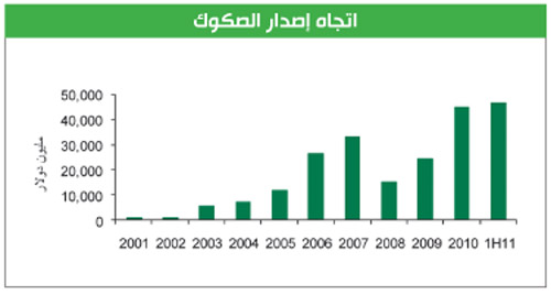 وأوضح التقرير أن الصكوك تمثل عنصرا رئيسا لسوق رأس المال الإسلامي، الذي يعد الهيكل الثاني بعد الأسهم. وبمرور السنوات، شهد سوق الصكوك نموا يصل إلى ما قيمته 161.5 مليار دولار، أي ما نسبته 13.9 في المئة من إجمالي الأصول المالية الإسلامية العالمية في النصف الأول من عام 2011. وقد شهد النصف الأول من عام 2011 نموا في الإصدارات بنسبة سنوية بلغت 208.5 في المئة لتصل إلى ما قيمته 47.1 مليار دولار. وخلال تلك الفترة، سيطرت منطقة جنوب شرق آسيا على إصدارات الصكوك بنسبة 70.4 في المئة (2010: 81.6 في المئة) من إجمالي الإصدارات، بينما بلغت الإصدارات في منطقة الشرق الأوسط وشمال أفريقيا 27.3 في المئة (2010: 15.6 في المئة). وتسود التوقعات الايجابية لصناعة الصكوك نظرا للدعم المتواصل من السلطات التنظيمية فضلا عن النمو الاقتصادي القوي والتنمية الحاصلة في الأسواق الناشئة مما يضمن إحياء مشاريع البنية التحتية في كل من أسواق رأس المال التقليدية والإسلامية على حد سواء.