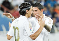 لعب ريال مدريد معظم فترات الشوط الاول في منتصف ملعب الكويت وقاد مسعود اوزيل بناء الهجمات من خلال تمريراته سواء الطولية البينية الى بنزيمة الذي اتيحت له فرصتان لكن لم يوفق في التسجيل قبل ان يغادر الملعب لحساب كالي خون او من خلال تمريراته العرضية التي ساهمت في تقدم ظهيري الاجانب، ووضحت مهاراته كصانع العاب من خلال تحركاته الايجابية سواء بالكرة والتي منها وسع زوايا الرؤية امام انخيل عندما سدد كرة الهدف الاول او من التفاهم السريع من كرات «هات وخد» مع رونالد والتي كثيرا ما ضرب بها دفاع الكويت.