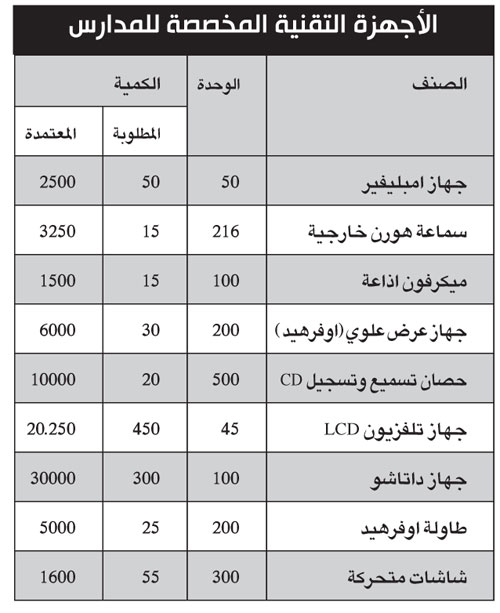 والجدول التالي يوضح الأجهزة التقنية مقرونة بالأعداد والمبالغ المعتمدة لكل منها: