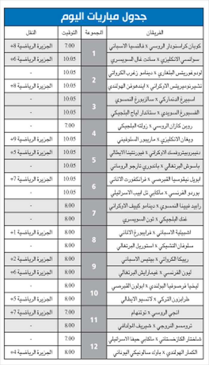 وفي المباريات الاخرى يلعب يلعب اسبيرغ الدنماركي مع سالزبورغ النمسوي والفسبورغ السويدي مع ستاندار لياج البلجيكي (المجموعة الثالثة)، ورابيد فيينا النمسوي مع دينامو كييف الاوكراني وغنك البلجيكي مع ثون السويسري (السابعة)، وشاختيور كاراغاندي الكازخستاني مع ماكابي حيفا الاسرائيلي والكمار الهولندي مع باوك سالونيكي اليوناني (الثانية عشرة).