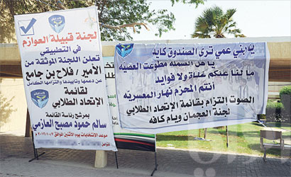 لوحظ أمس في انتخابات طلاب «التطبيقي» استخدام لافتات تأييد لهذه القائمة او تلك مدعومة من امراء وشيوخ القبائل، واستنكر عميد النشاط والرعاية الطلابية في الهيئة العامة للتعليم التطبيقي والتدريب الدكتور خليفة بهبهاني هذا الأمر، مشيرا إلى أن هذه الانتخابات طلابية، ويجب ان ترقى إلى ان تكون ديموقراطية لا ان تكون قبلية وطائفية. (تصوير زكريا عطية)