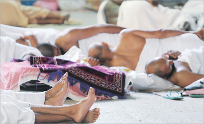 حجاج استلقوا على الأرض في الحرم المكي الشريف انتظاراً لصلاة الصبح أمس (أ ف ب)
