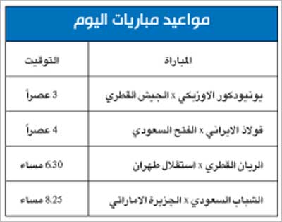 ويحل الجيش القطري والفتح السعودي ضيفين على بونيودكور الاوزبكي وفولاذ اصفهان الايراني على التوالي، وكانت الجولة الاولى في 25 فبراير الماضي اسفرت عن تعادلين سلبيين، الاول بين الفتح وبونيودكور، والثاني بين الجيش وفولاذ.