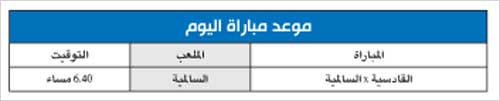 يحل مساء اليوم القادسية ضيفا على السالمية في استاد ثامر في المباراة المؤجلة من المرحلة الحادية والعشرين للدوري «فيفاليغ» في كرة القدم، تقام المباراة الساعة السابعة إلا ثلثا.