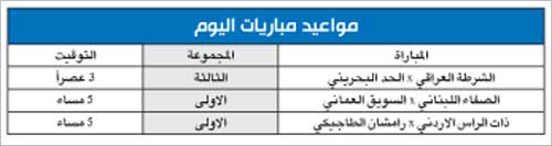 وسيكون للصفاء اللبناني فيها الكلمة العليا حين يستضيف فريق السويق العماني على استاد المدينة الرياضية في بيروت وسيكون على موعد مع التأهل المباشر عن المجموعة الأولى دون انتظار بقية النتائج إن حقق النقاط الثلاث،