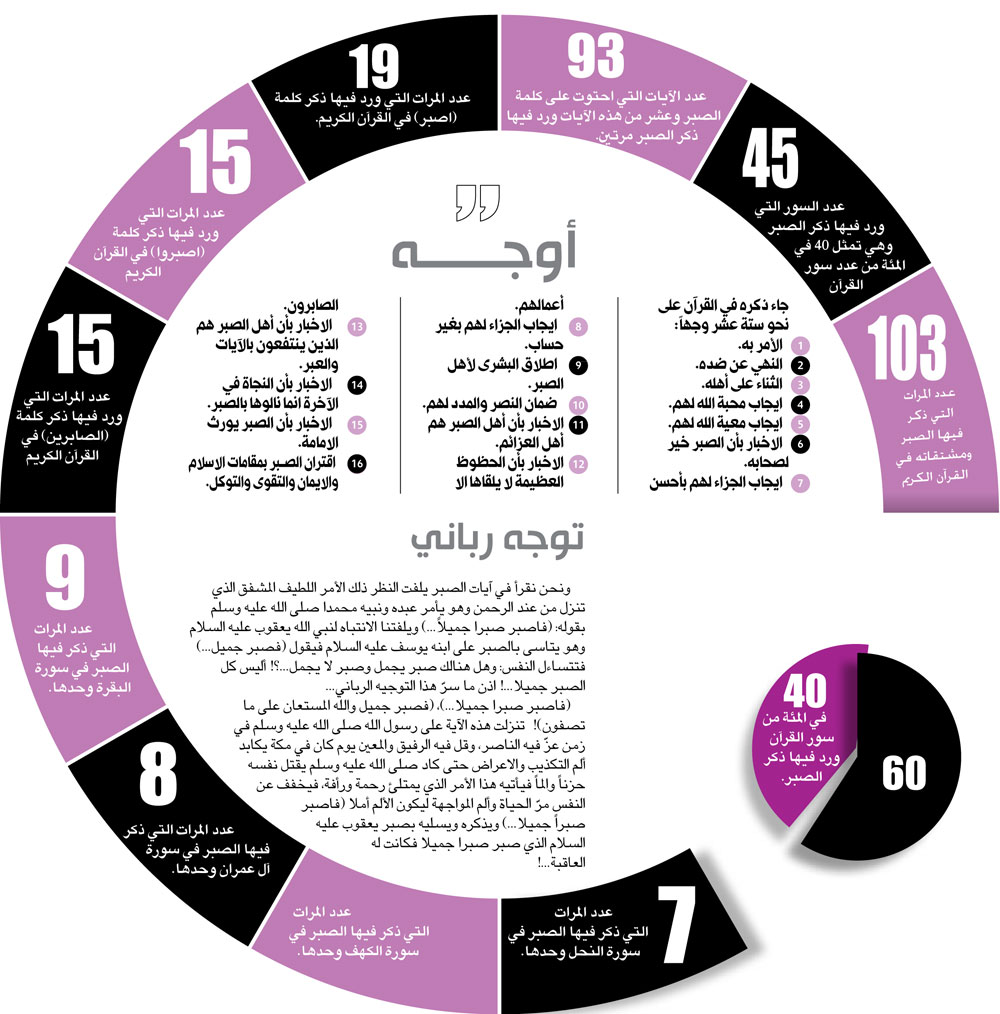 • لأهمية الصبر ذكره الله في أكثر من تسعين موضعاً في القرآن و قرنه بالصلاة وجعل مقامات الدين كلها مرتبطة به