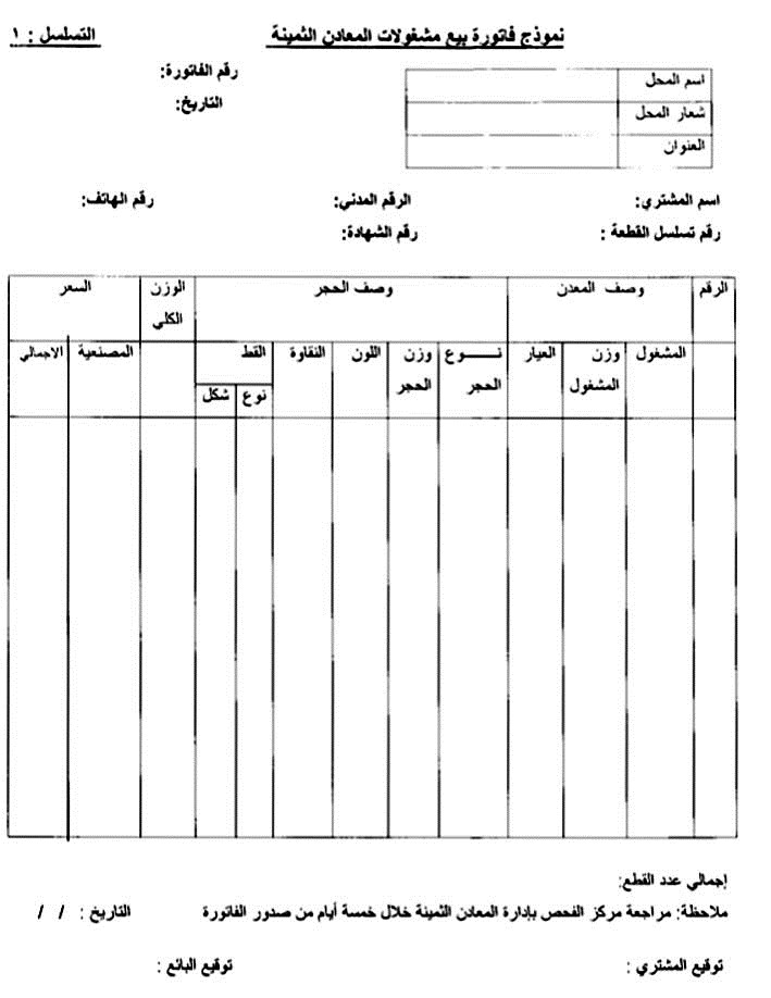 وتحتوي الفاتورة الجديدة للمشغول المباع، اسم المشغول، ونوع المعدن، والعيار، ووزن المشغول (خالي من الأحجار)، ووزن المشغول متضمناً الحجر، الى جانب تفاصيل أخرى تتعلق بالمشغول الذي يحتوي على حجر من بينها (نوع الحجر، القيراط، النقاوة، اللون، الصفاء).