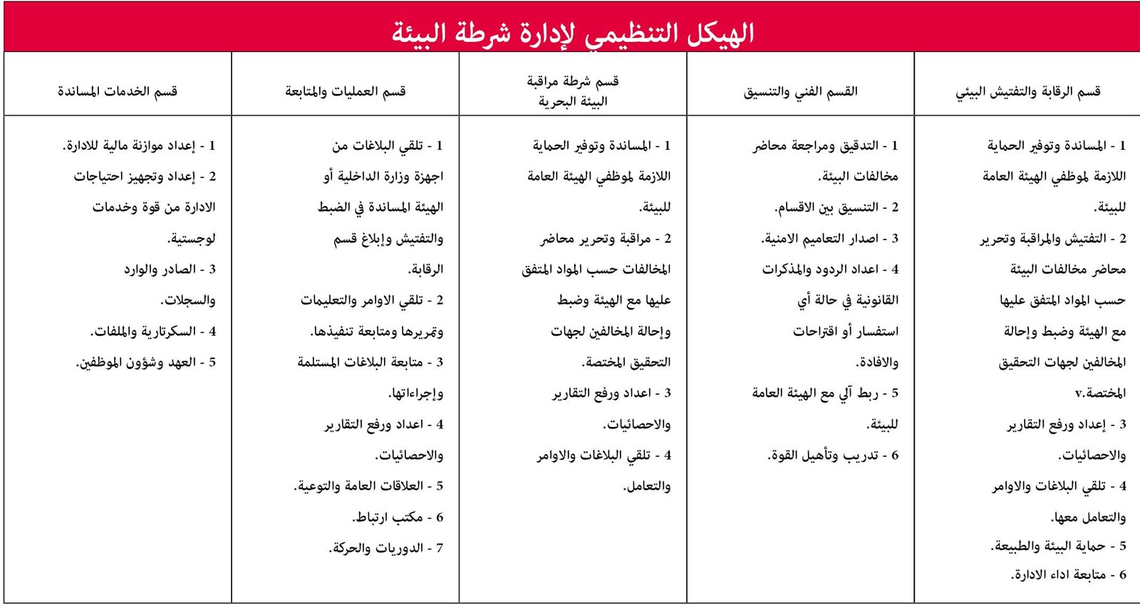 - تنفيذ قرارات الوزارات المختصة في الأحوال التي تشكل خطراً أو في بعض حالات الطوارئ من خلال إزالة المخالفات البيئية أو الإغلاق الموقت للمواقع المحددة بتلك القرارات.
