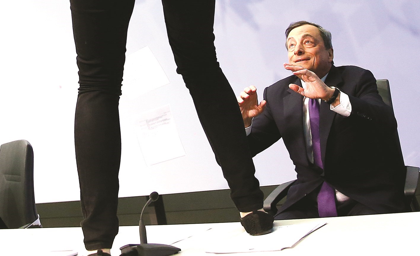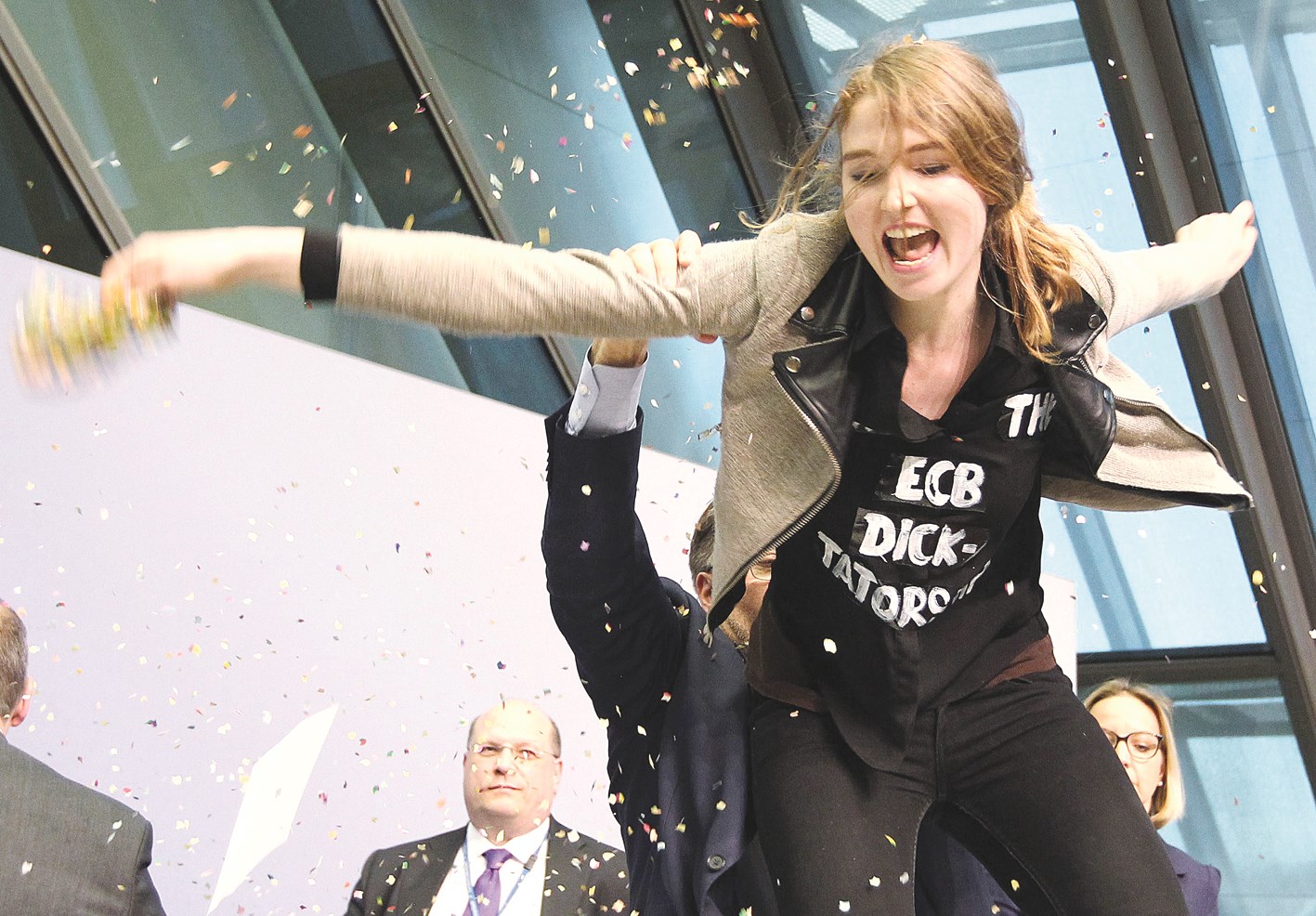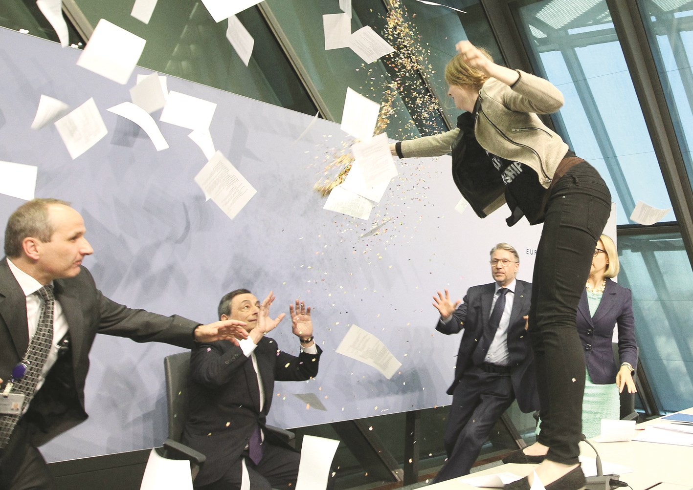يلقّب محافظ البنك المركزي الأوروبي ماريو دراغي بـ «سوبر ماريو»، لكن هذه السيدة تمكّنت بخفّة لاعبي الكاراتيه من القفز فوق المنصّة خلال مؤتمر صحافي كان يعقده في فرانكفورت أمس، لتبعثر أوراقه وتهتف ضد «دكتاتوريّة» البنك المركزي الأوروبي، فكانت هذه الصور النادرة لمصوّري «رويترز» و«أ ف ب».