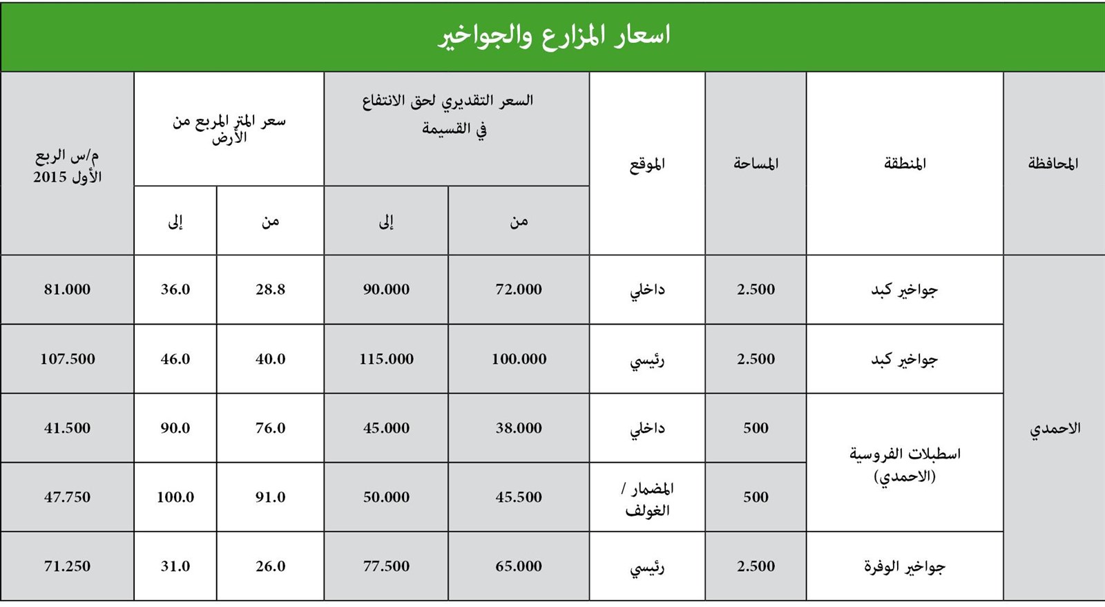 وأظهر التقرير استمرار حالة الاستقرار التي تشهدها منطقة الجواخير بمحافظة الأحمدي في متوسط سعر المتر المربع خلال الربع الأول مسجلاً 79.4 دينار لمتوسط سعر المتر، كما استقرت منطقة جواخير الهجن بالمحافظة، بينما استقرت الأسعار في مناطق اسطبلات الفروسية أيضاً في الربع الأول للمرة الرابعة على التوالي، إذ استقرت الأسعار في منطقة المضمار والغولف وفي مناطقها الداخلية، واستقرت الأسعار خلال الربع الأول من 2015 في الأماكن الرئيسية والأماكن الداخلية في جواخير منطقة الوفرة.