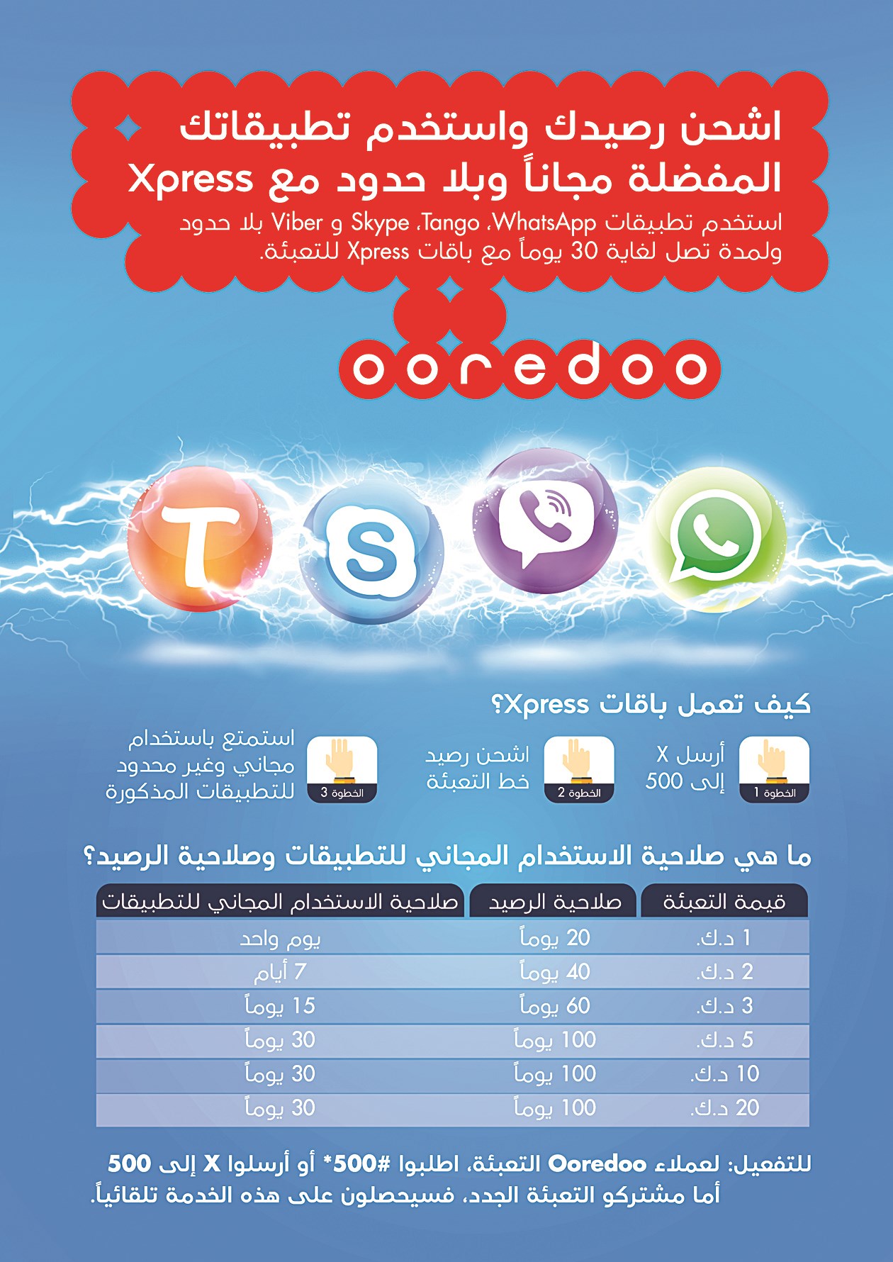 أعلنت شركة «Ooredoo الكويت»، التابعة لمجموعة «Ooredoo العالمية للاتصالات»، عن طرح عرض خاص لعملاء خدمة الدفع المسبق، Xpress، يتيح لهم الاستفادة من أربعة من أكثر تطبيقات الهواتف الذكية استخداماً، وتمنح الخدمة الجديدة عملاء Xpress استخدام المجاني وغير محدود لأربعة من أكثر التطبيقات استخداماً وشيوعاً، وهي WhatsApp وTango وViber، وSkype، ويتم تفعيل هذه الخدمات تلقائياً عند إعادة التعبئة لتبقى سارية لمدة تتراوح ما بين 24 ساعة و30 يوماً، حسب قيمة الرصيد الذي يتم تعبئته.