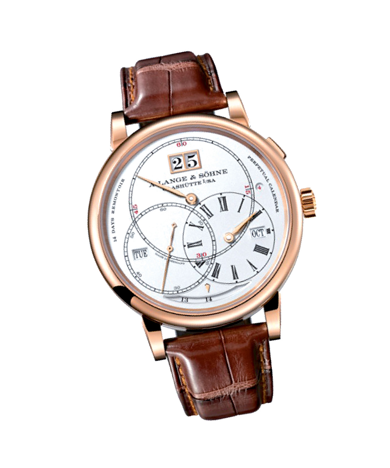 ساعة GRAND COMPLICATION الأكثر تعقيداً من إبداع «إيه. لانغيه آند صونه»، عرض أطوار القمر هو واحدٌ من العديد من الروائع التقنية. تتضمن الساعة آلية إعلان الوقت بالدقّات مع دقّات صغيرة وكبيرة وآلية مُعيد الدقائق التي تصدر صوتاً مُذكراً بالدقائق وكرونوغراف الثواني المجزأة مع عدّادٍ للدقائق والثواني الطائرة إضافة إلى التقويم الدائم.