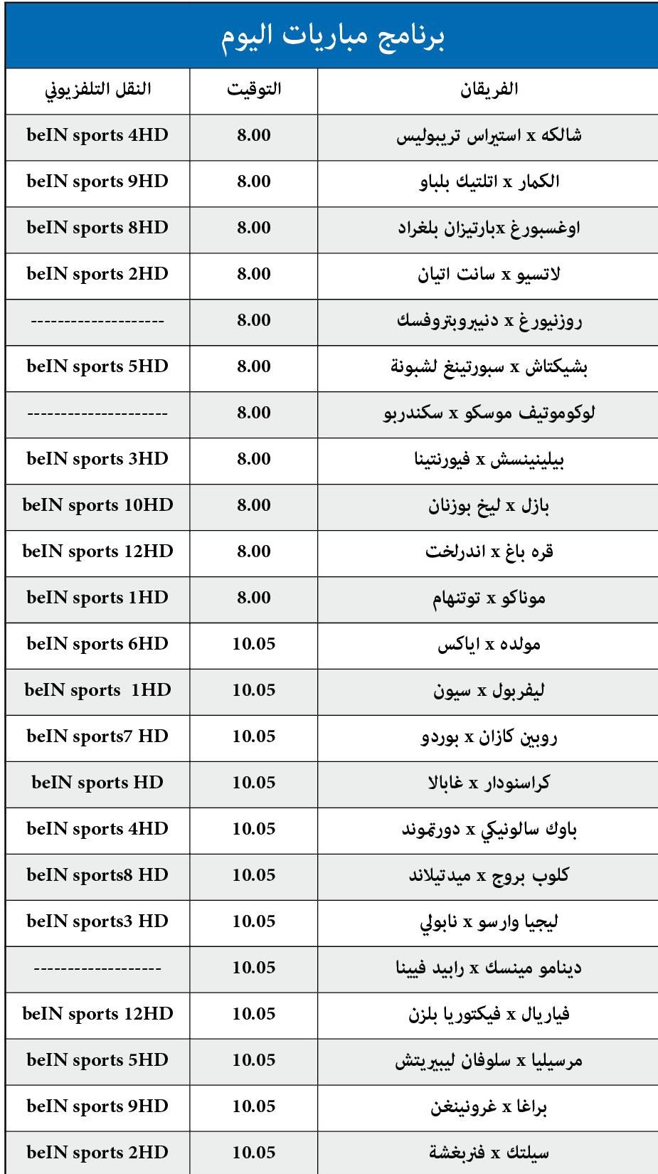وفي المجموعة الثامنة، خسر ليون الفرنسي امام ضيفه فالنسيا الإسباني بهدف للجزائري سفيان فيغولي (42)، وفاز زينيت سان بطرسبورغ الروسي على ضيفه لاغانتواز البلجيكي بهدفين لارتيم دزيوبا (35) واوليغ شاتوف (67)، مقابل هدف لتوماس ماتون (56).