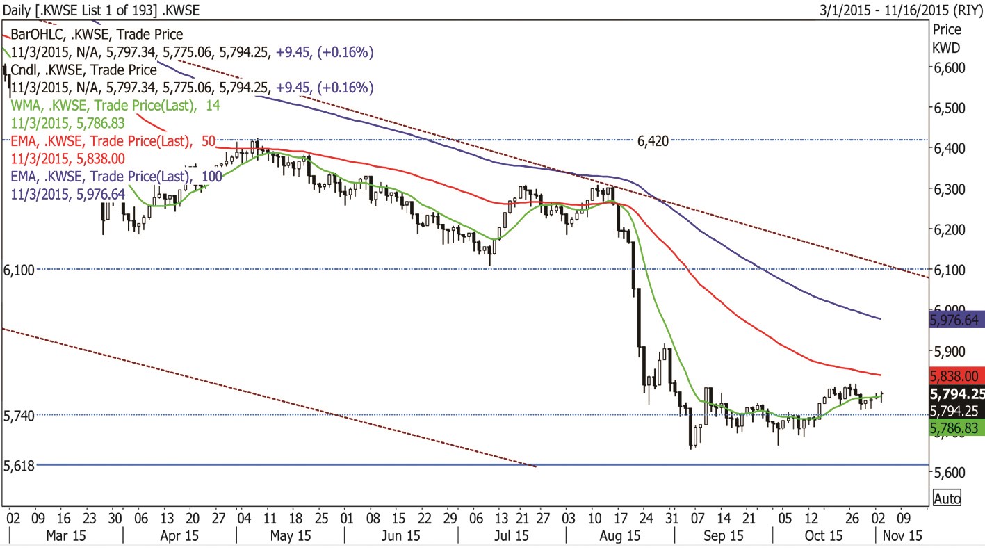 رأى التحليل الفني لشركة كامكو للاستثمار، أن السوق يشهد في الآونة الأخيرة حركة جانبية ضمن نطاق ضيق، ما يشير الى التردد بكسر خط المقاومة الواقع بالقرب من 5.800 نقطة.