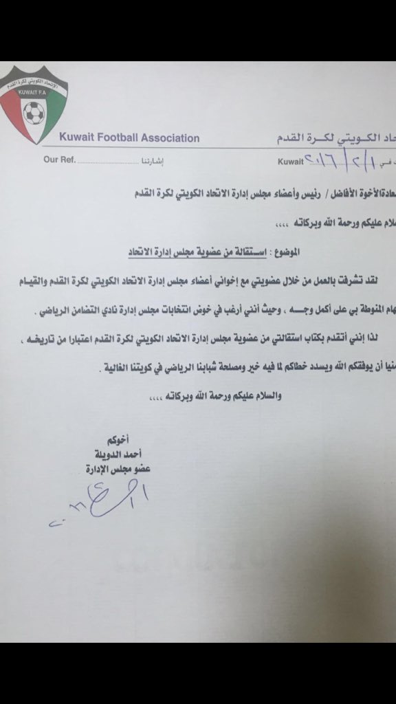 تقدم عضو مجلس إدارة اتحاد الكويتي لكرة القدم ورئيس لجنة المسابقات أحمد الدويلة استقالته رسميا من أجل خوض انتخابات نادي التضامن الرياضي والمقرر إجراؤها في الثاني عشر من مارس المقبل.