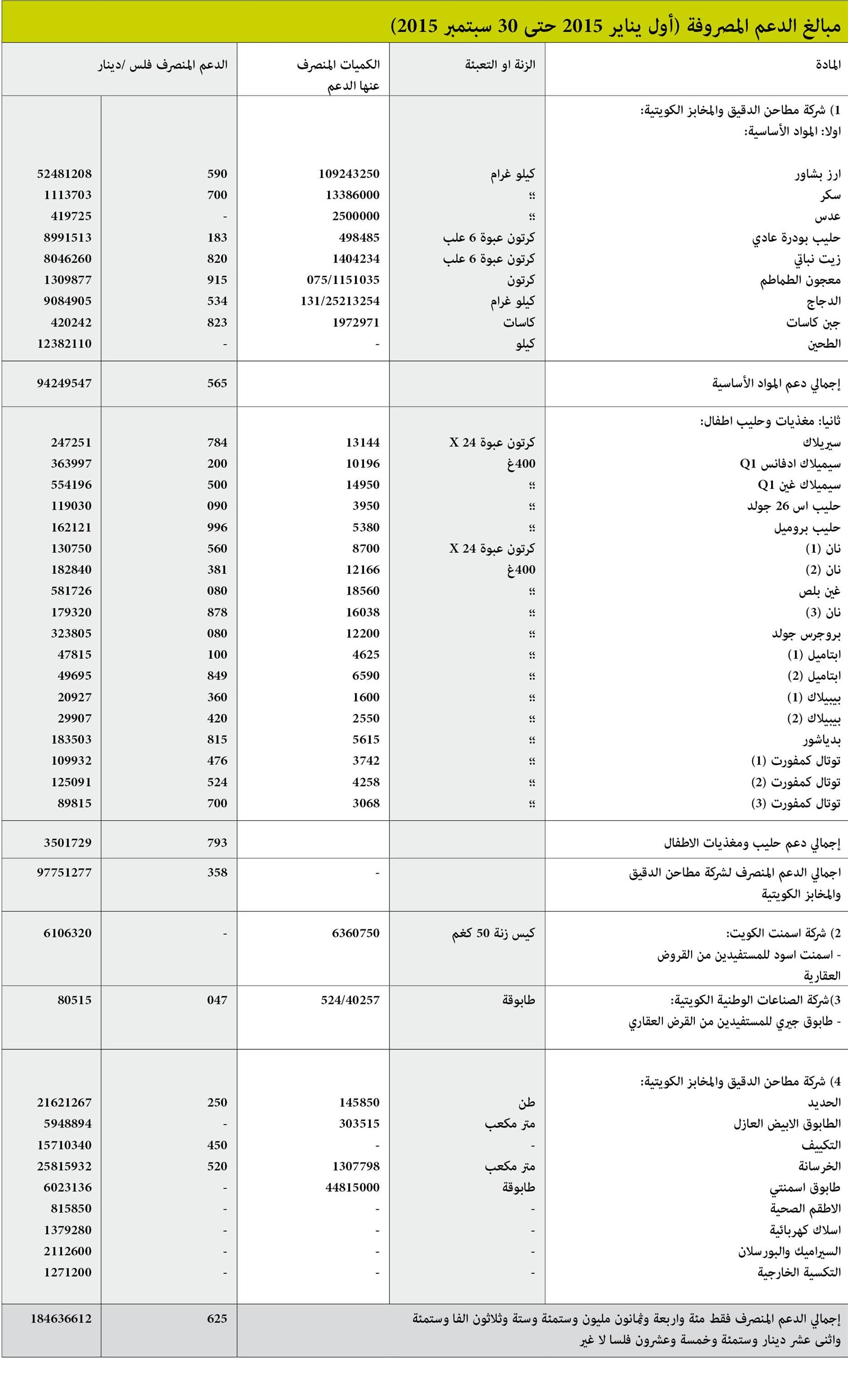 وبلغ إجمالي الدعم الذي تم صرفه على المواد الغذائية والإنشائية المدرجة ضمن البطاقة التموينية من أول يناير 2015 وحتى نهاية ديسمبر الماضي نحو 200 مليون دينار، موزعة على نحو 40 سلعة، من بينها 18 منتج ألبان، علما بأن حصة الفرد الواحد من الدعم التمويني تبلغ شهرياً نحو 8.6 دينار.