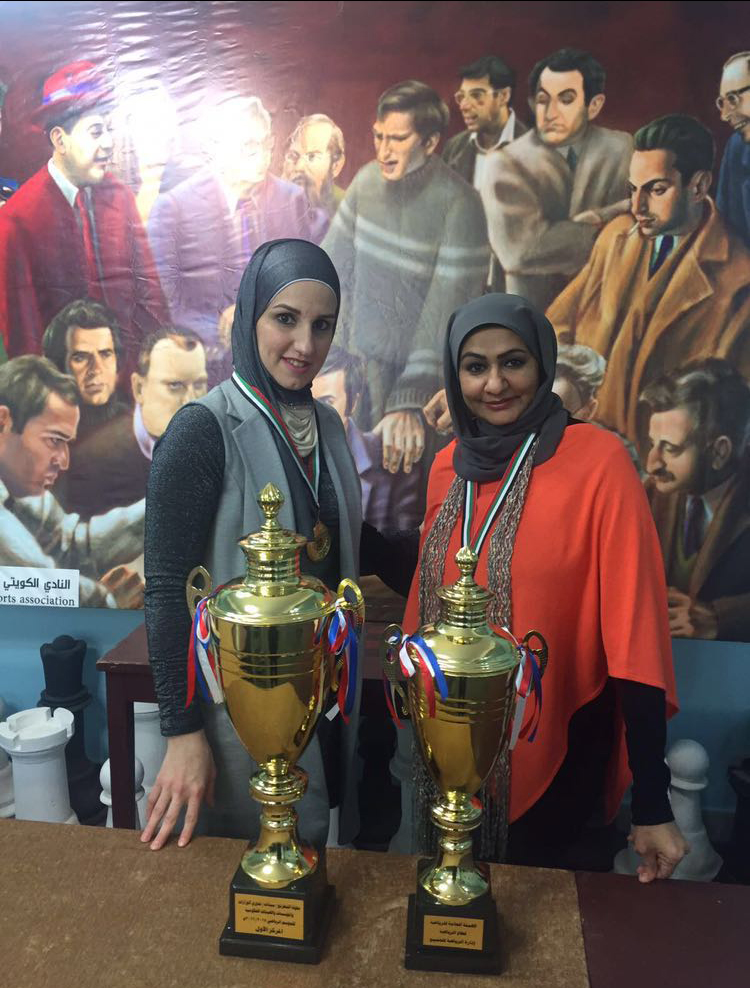 تقدم الأمين العام المساعد لشؤون إدارة المرافق بجامعة الكويت الدكتور آدم الملا بالتهنئة لمنتخب جامعة الكويت للشطرنج - سيدات الذي يضم اللاعبة شهلا رئيسي من كلية الطب واللاعبة سعاد الكندري من إدارة المشتريات على حصولهما على المركز الأول والثاني ببطولة دوري الوزارات للشطرنج - سيدات.