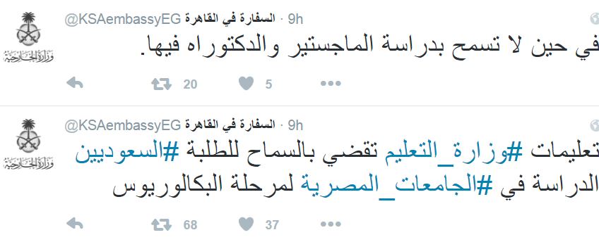 قالت السفارة السعودية في القاهرة إن تعليمات وزارة التعليم تقضي بالسماح للطلبة السعوديين بالدراسة في الجامعات المصرية لمرحلة البكالوريوس فقط.