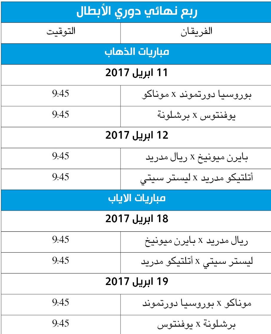 أما المواجهتان الاخريان في هذا الدور، فتجمعان اتلتيكو مدريد الإسباني وصيف البطولة مرتين في السنوات الثلاث الاخيرة، مع ليستر سيتي الإنكليزي، مفاجأة الموسم الحالي، وبوروسيا دورتموند الألماني مع موناكو الفرنسي.