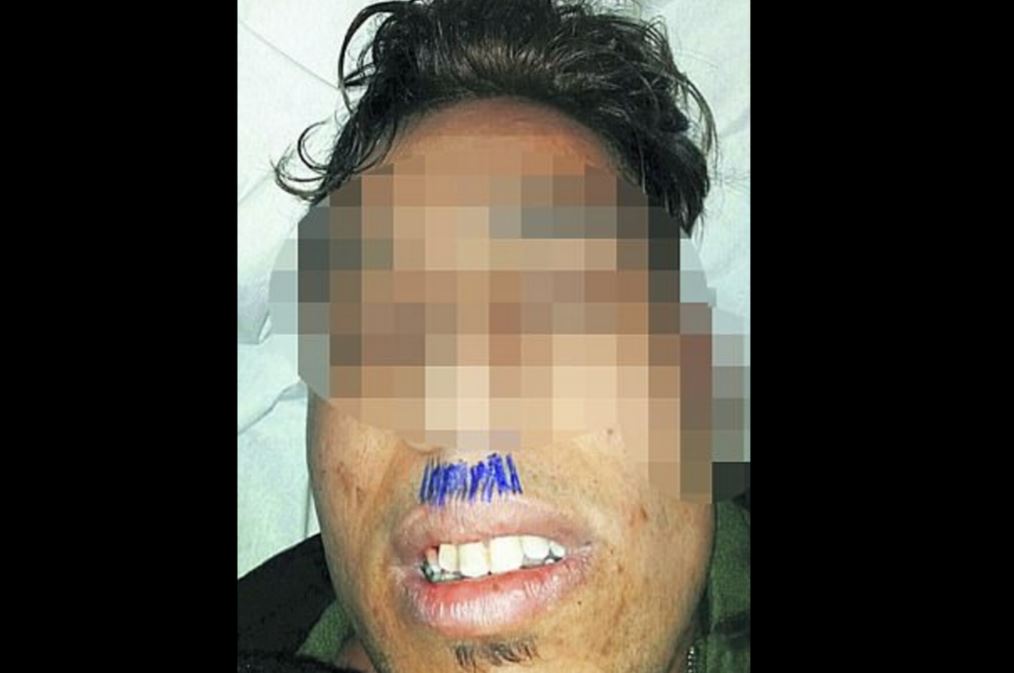 وظهر اللاجئ ممددا في وضعية خطأ داخل سيارة للإسعاف وقد رسم المسعف بالقلم الجاف شنبا صغيرا على وجهه يشبه شنب هتلر، وكتب تحتها: «الضحية رقم 1: شوارب عصرية».