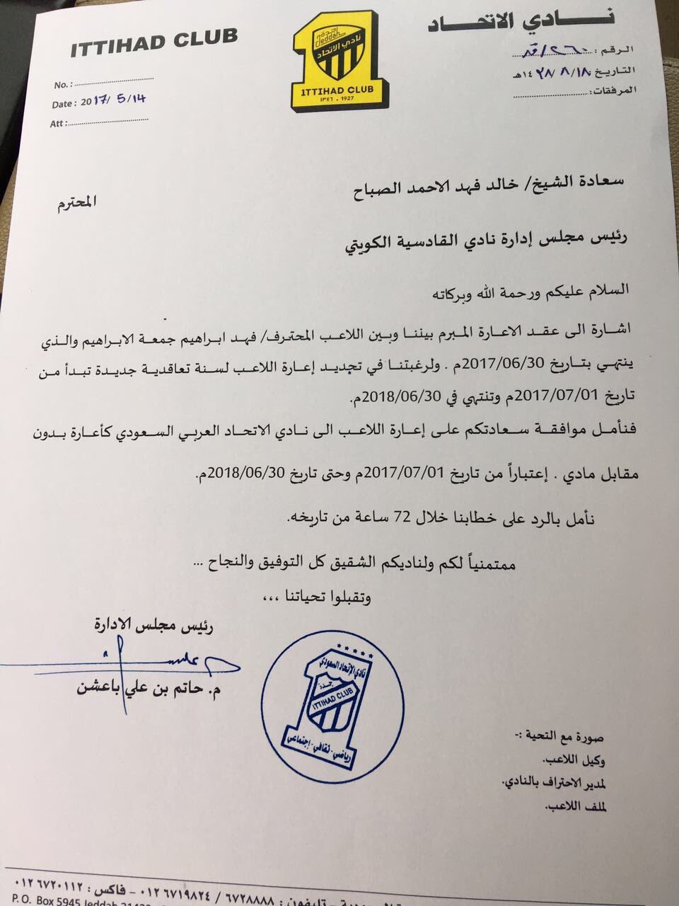 انتقد مجلس إدارة نادي القادسية صيغة الكتاب المرسل من إدارة نادي الاتحاد السعودي في شأن تمديد إعارة اللاعب فهد الانصاري موسما إضافيا دون مقابل مادي.